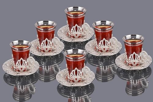 Generic - طقم أكواب شاي تركي فاخر، 6 قطع بتصميم تقليدي مع صحون فضية، أكواب زجاج مزخرفة للمشروبات الساخنة، مجموعة إجمالية من 12 قطعة