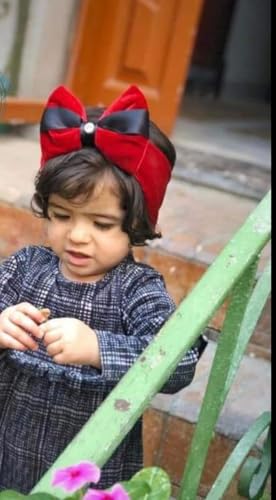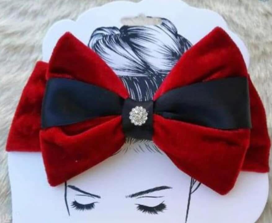 - ١) تصميم فاخر: فيونكة مخملية حمراء كبيرة مع شريط أسود في المنتصف، مزينة بحجر كريستالي براق