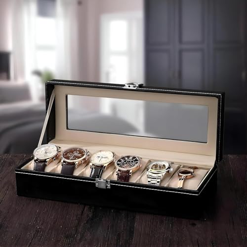 Generic - صندوق منظم ساعات - حافظة من الجلد الصناعي بـ 6 فتحات بغطاء زجاجي شفاف - عرض تخزين مثالي للساعات والمجوهرات والاكسسوارات