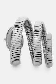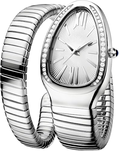 Generic - ساعة نسائية فاخرة بتصميم ثعبان ملتف، إطار مرصع بالفصوص ، سوار معدني فضي، ميناء أبيض مشع