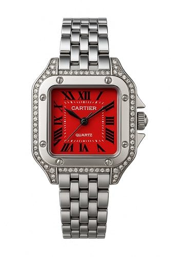Generic - ساعة يد نسائية فاخرة، إطار ثماني الأضلاع مرصع بالكريستال، مينا حمراء، سوار معدني فضي