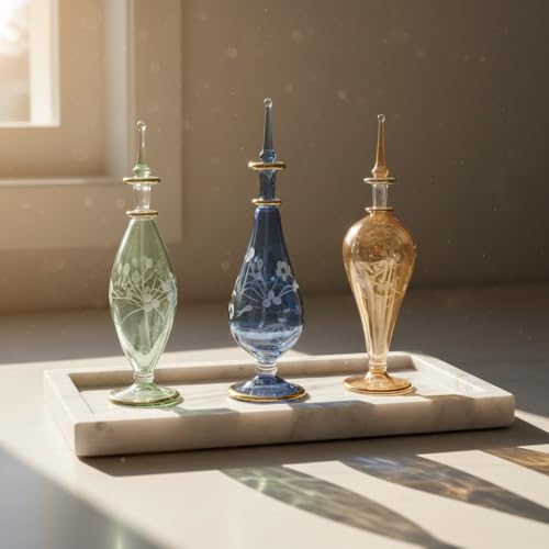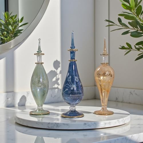 - تصميم أنيق: مجموعة من 3 زجاجات عطر زجاجية على الطراز المصري تتميز بسدادات مزخرفة وأنماط جميلة مزينة بالزهور لإضفاء لمسة زخرفية فاخرة.