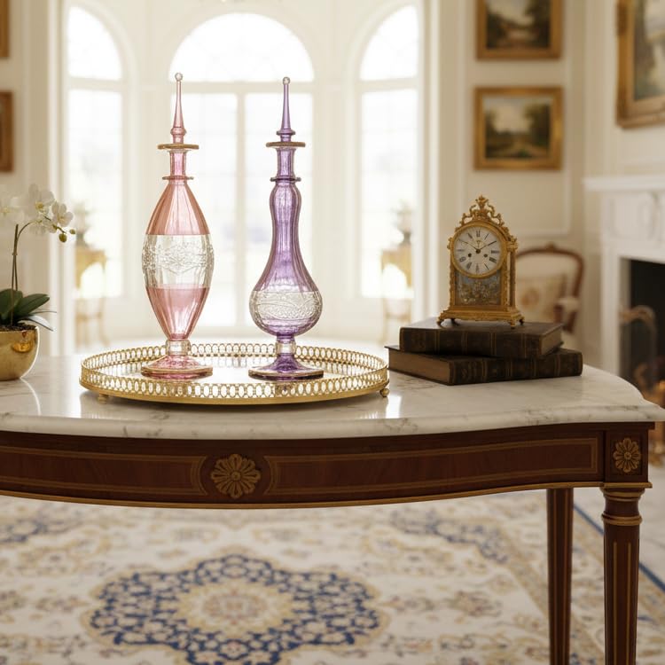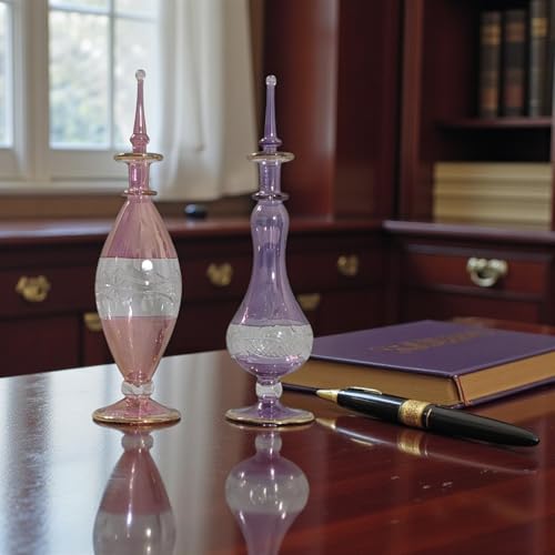 - تصميم أنيق: مجموعة من زجاجتي عطر على الطراز العتيق تتميز بأنماط مقطوعة بالكريستال بدرجات اللون الوردي والأرجواني الساحرة مع سدادات زجاجية مزخرفة