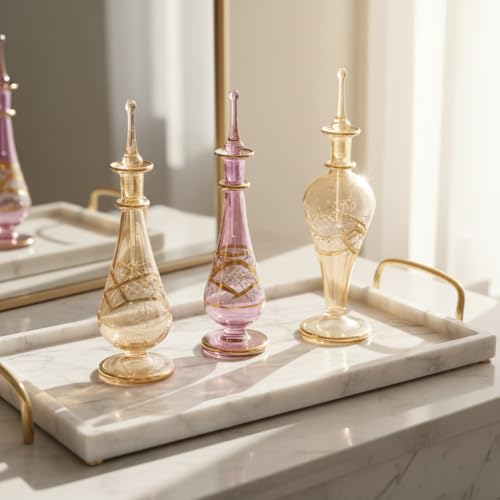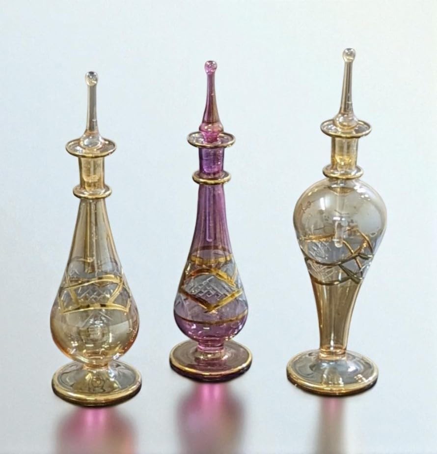 - تصميم مصنوع يدويًا: مجموعة من 3 زجاجات عطر زجاجية رائعة منفوخة بالفم تتميز بتصميمات مصرية تقليدية أنيقة مع لمسات ذهبية معقدة