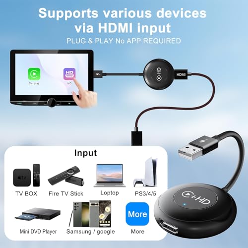 - 【محول تلفزيون متعدد الوسائط للسيارة HDMl】يمكن لدونجل كاربلاي اللاسلكي للسيارة هذا تحويل سيارتك إلى مركز ترفيه متنقل ببساطة عن طريق توصيل الأجهزة بمخارج HDMI وفاير تي في ستيك ووحدات تحكم الألعاب وصناديق فك التشفير وأجهزة عرض الشاشة. اجعل الجميع يستمتعون بالمتعة بعد رحلة طويلة من خلال تشغيل العروض والأفلام والألعاب مباشرة على شاشة السيارة.