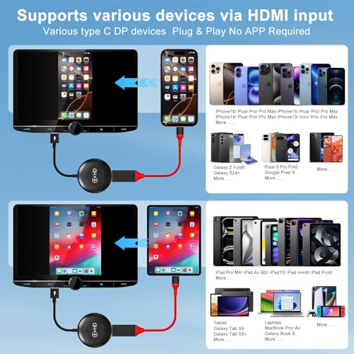 - 【توافق عالمي】يدعم محول السيارة تي في ميت أجهزة الوسائط المتعددة مع منفذ HDMI داخل سيارتك، مثل فاير / جوجل تي في ستيك وجهاز تشغيل ألعاب الفيديو الرقمية والموبايلات الذكية والتابلت وماك بوك. يعمل دونجل كاربلاي اللاسلكي لتلفزيون السيارة هذا مع جميع السيارات تقريبًا مع كار بلاي السلكي من المصنع ومتوافق مع جميع موديلات آيفون 6 أو أعلى من IOS 10 إلى IOS 17. يرجى ملاحظة ما يلي: بي ام دبليو وتيسلا غير متوافقين.