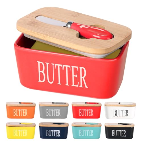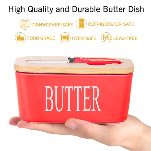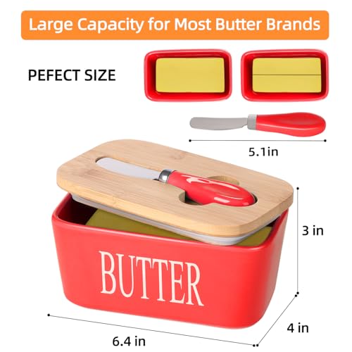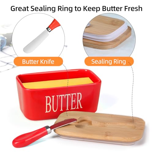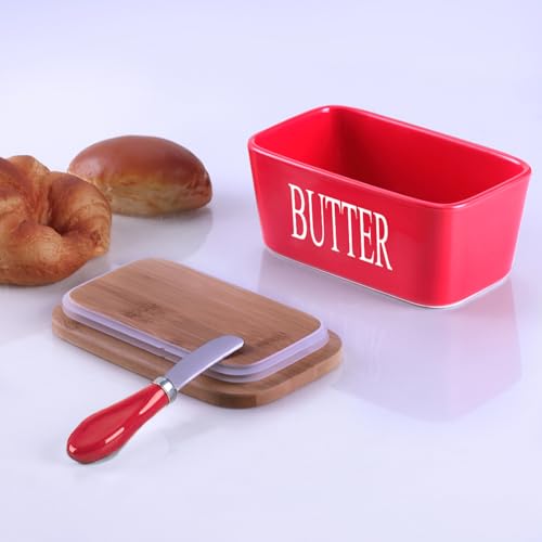 Lxmons - علبة حفظ الزبدة من السيراميك مع غطاء خشبي، علبة تخزين كبير مزودة بسكين زبدة من الفولاذ مقاوم للصدأ وغطاء من البامبو وحلقة سيليكون محكمة الغلق لأنواع الزبدة الشرقية والغربية من لكسمونس، بلون أحمر