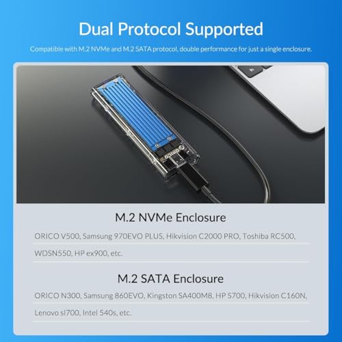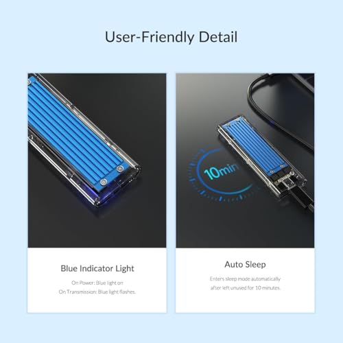 - تصميم متوافق: حاوية M.2 NVMe SSD مع حافظة شفافة ومبدد حراري أزرق، يتميز بوصلة USB 3.1 نوع C مع كابل محول USB-A متضمن للاتصال متعدد الاستخدامات