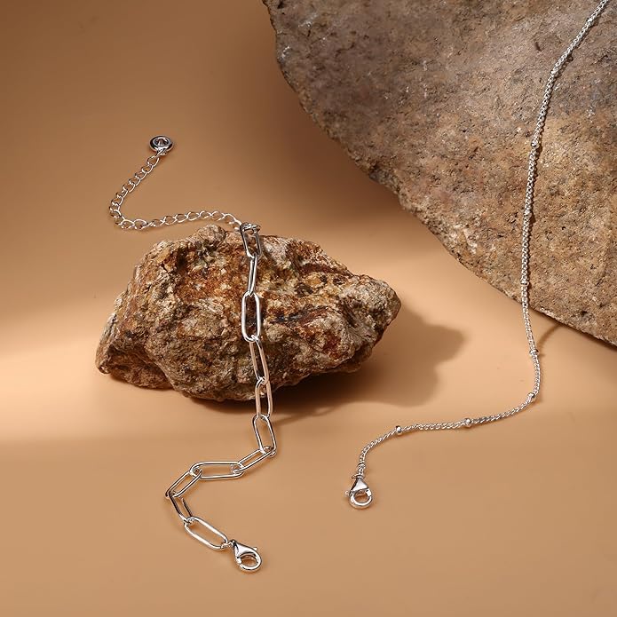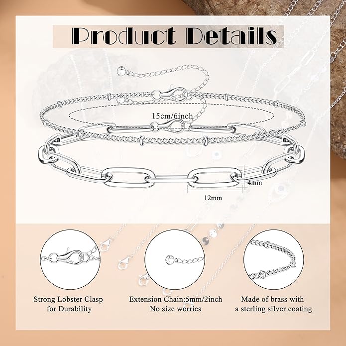 Generic - أساور سلسلة بمشبك من الفضة الإسترلينية مطلية بالذهب الأبيض ومزينة بفصوص ماسية للنساء من ام.ايه.اس، أساور خرز متعددة الطبقات قابلة للتعديل للنساء والبنات