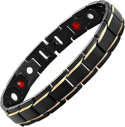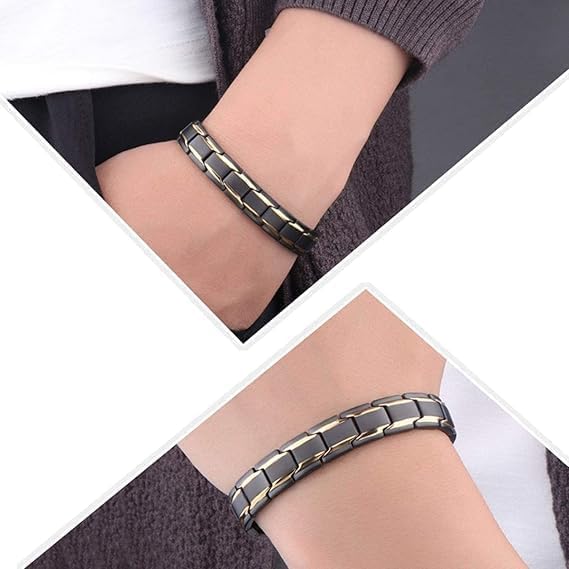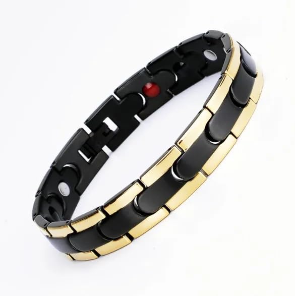 Generic - سوار علاجي مغناطيسي اسود وذهبي للرجال والنساء من ام ايه اس - سوار صحي انيق من الستانلس ستيل مع ايونات سالبة وعناصر الجرمانيوم والأشعة تحت الحمراء قطعة واحدة - 22 سم