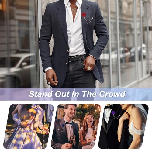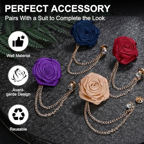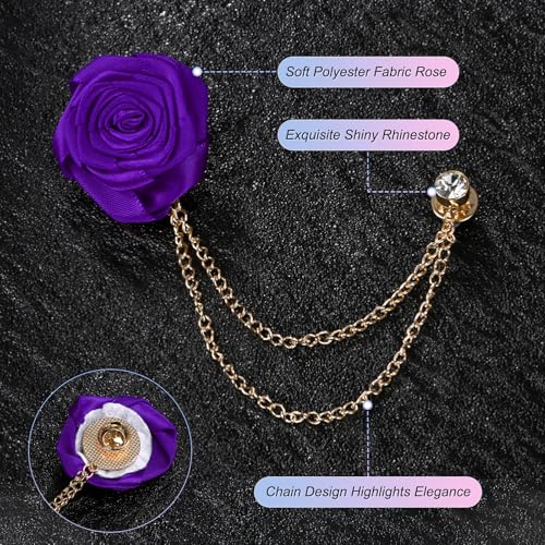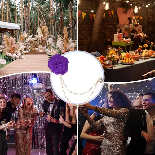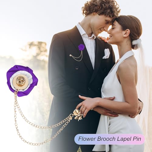 M METERXITY - دبوس بروش على شكل زهرة وردية للبدل للرجال، دبوس طية صدر مصنوع يدويا على شكل زهرة مع شارة ذهبية وسلسلة بشراشيب للرجال لاكسسوارات الزفاف والحفلات الراقصة من ام ميتركسيتي، لون أرجواني غامق