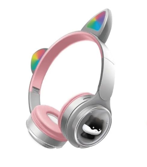 MERV - سماعات أذن لاسلكية بلوتوث بتصميم أذن قطة لطيفة مع شكل ثعلب ثلاثي الأبعاد وإضاءة ليد بألوان ار جي بي، سماعة رأس ستيريو للأطفال من الجنسين من M31، رمادي وردي