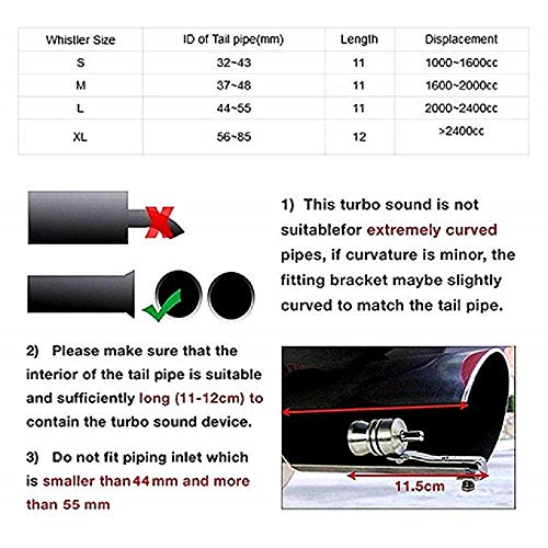 - √ أداء ممتاز --- هذا هو صوت صفارة الشاحن التوربيني، وصفارة ألومنيوم على علبة الشكمان وصوت مرور الهواء عبر أعلبة الشكمان. بعد تركيب هذا المنتج، فإن الضغط المنفوخ من أنبوب العادم سيجعل السيارة تبدو وكأنها شاحن تربو مع نظام شاحن توربيني أو صمام العادم.
