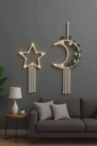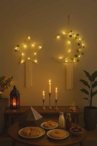 Generic - مكرميه هلال ونجمة معلق جدار رمضانيه ، قطن، 30 سم، 2 قطعة مع إضاءة LED، مزين بنباتات صناعية وورد فوم، يعمل بالبطارية، 3 أنماط إضاءة، يشمل 6 بطاريات إضافية