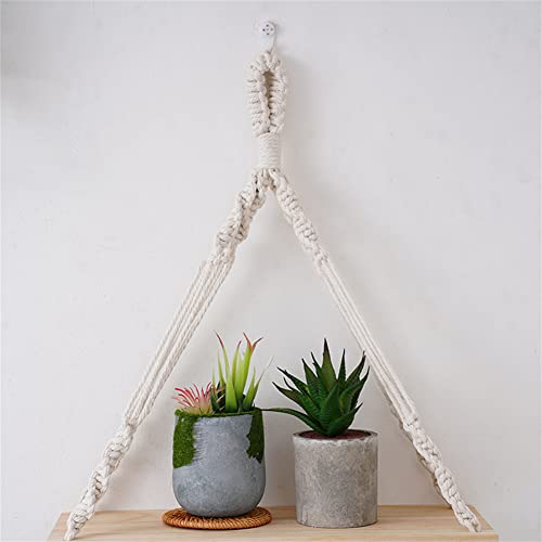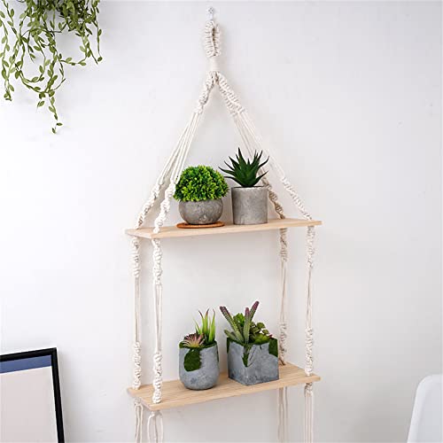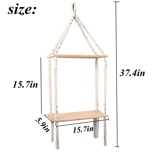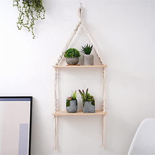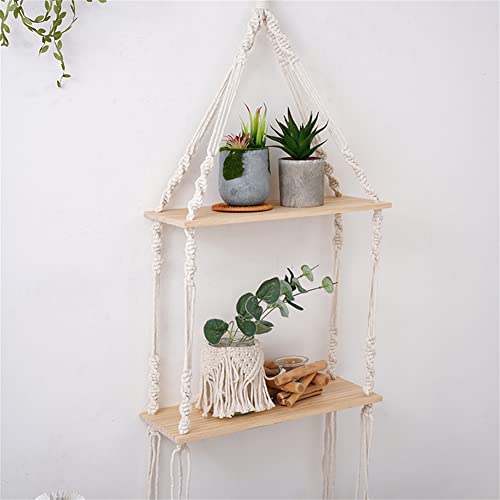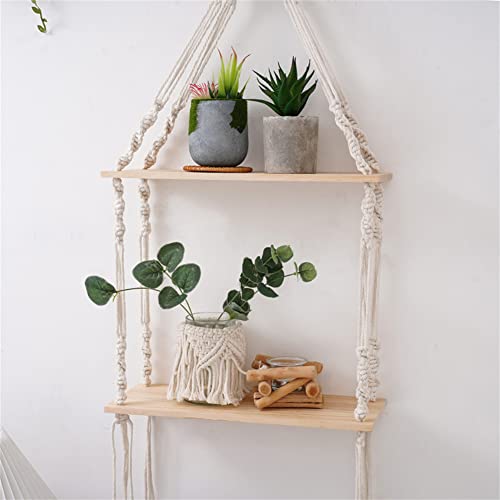 saved - ارفف معلقة مكرمية حائط خشبية ريفية مع شماعة منسوجة يدويا رف عائم من طبقتين لاطارات الصور والنباتات الصغيرة ديكور منزلي بوهو لغرفة النوم وغرفة المعيشة والحمام طبقتان متعدد الألوان