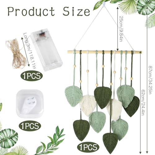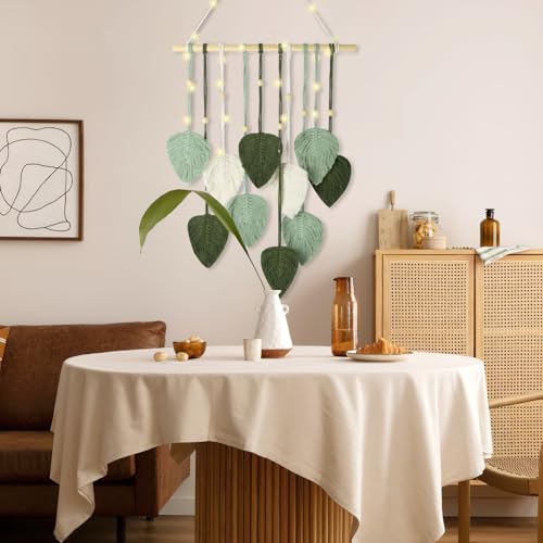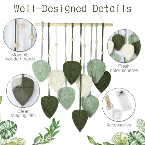 Aubess - بساط مكرمية للتعليق على الحائط مزخرف بشراشيب ديكور بوهو مع خرز خشبي واوراق خضراء حائط معلق اضاءة LED لغرفة النوم وغرفة المعيشة الاطفال