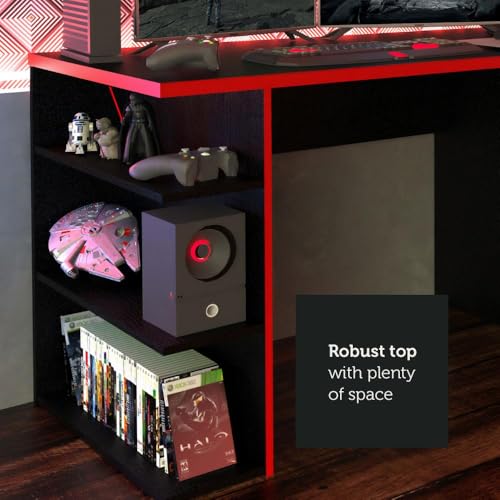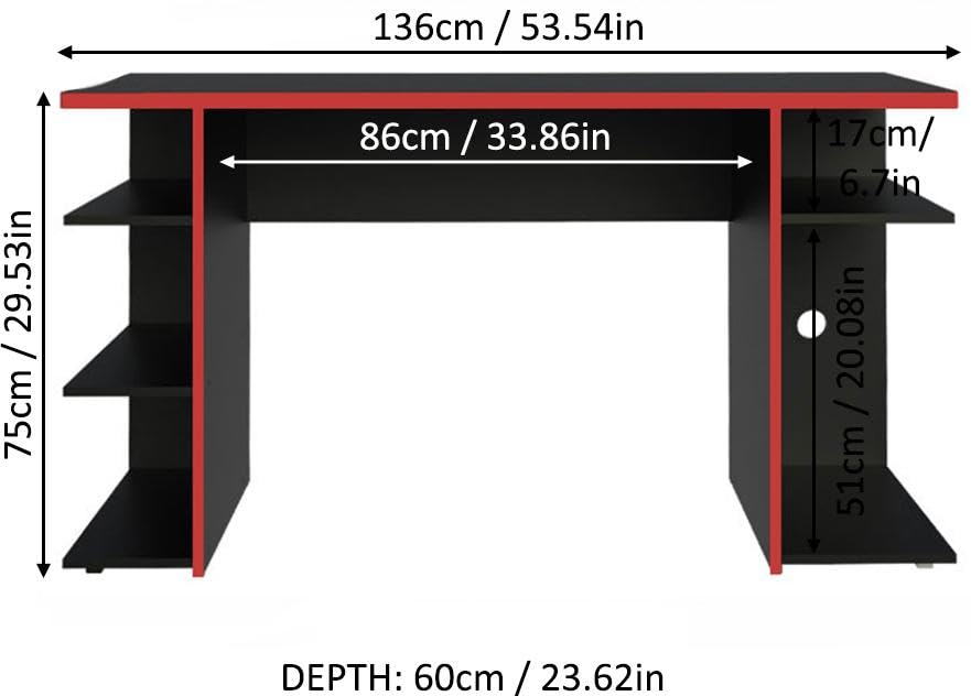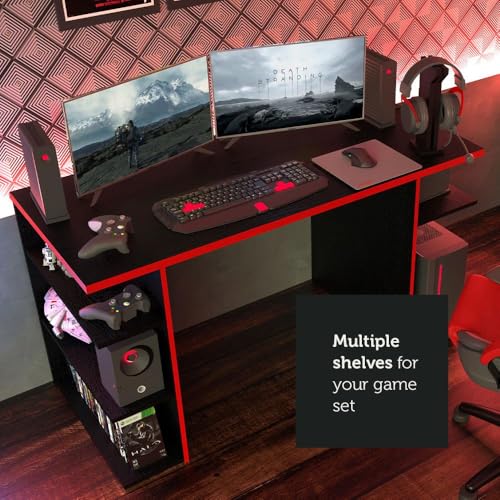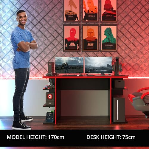 Madesa - مكتب كمبيوتر للألعاب وطاولة مكتب مع 5 أرفف وإدارة الكابلات من ماديسا، خشب، 1.36 متر عرض × 75 سم ارتفاع × 60 سم عمق (أبيض) (أسود وأحمر)