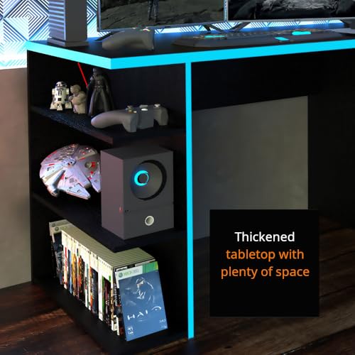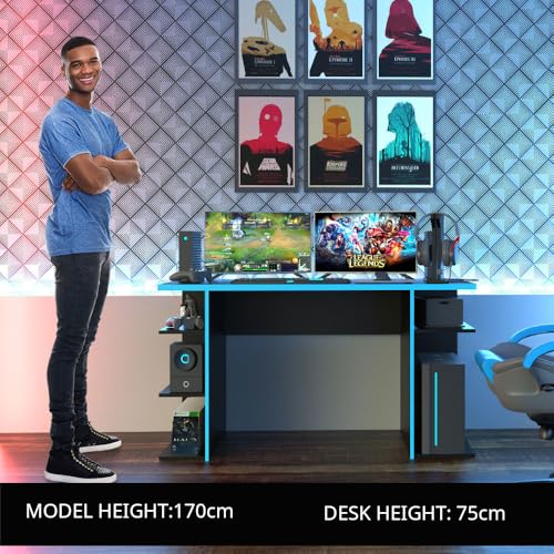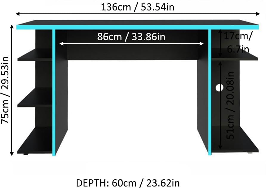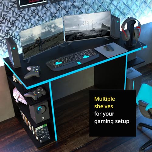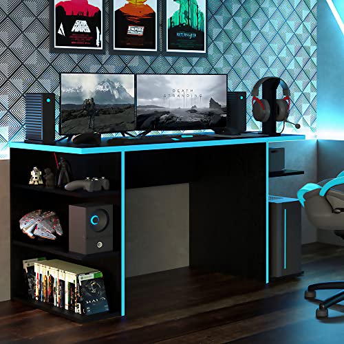 Madesa - ماديسا مكتب كمبيوتر العاب عصري كبير 53 انش مع 5 ارفف لادارة الكيبلات للطلاب والدراسة، طاولة خشبية للمنزل والمكتب والالعاب للاطفال والكبار - اسود/ازرق