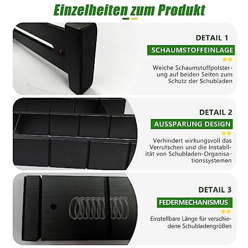 - سهل الاستخدام: منظم الأدراج مزود بآلية بسوستة تسمح لك بضبط الطول ليناسب أحجام الأدراج المختلفة.