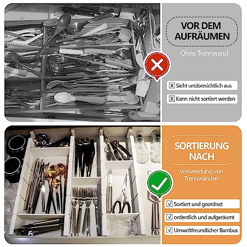 - الحماية: منظم أدوات المائدة الخاص بنا للأدراج مصمم بنظام حماية ناعم على كلا الجانبين لحماية أدراجك بشكل مثالي مع تخزين أغراضك بشكل أنيق.