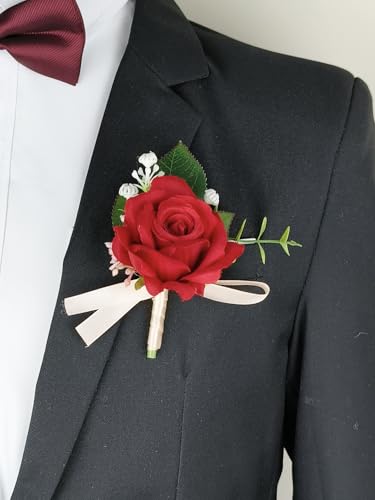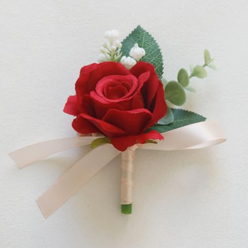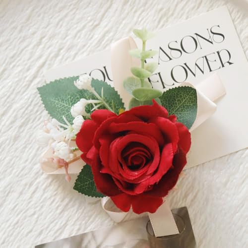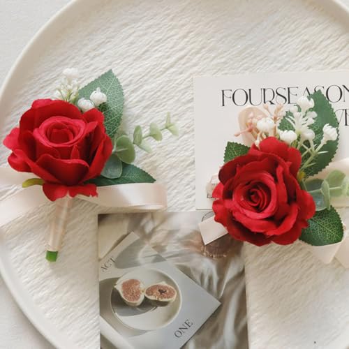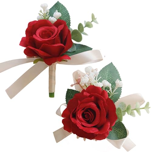 MAFELOE - طقم كورساج من زهور صناعية للمعصم مناسب لوصيفات العروس والبدلة لإكسسوارات حفلات الزفاف والحفلات الراقصة لون أحمر قطعتين مافيلو عدد القطع: 2