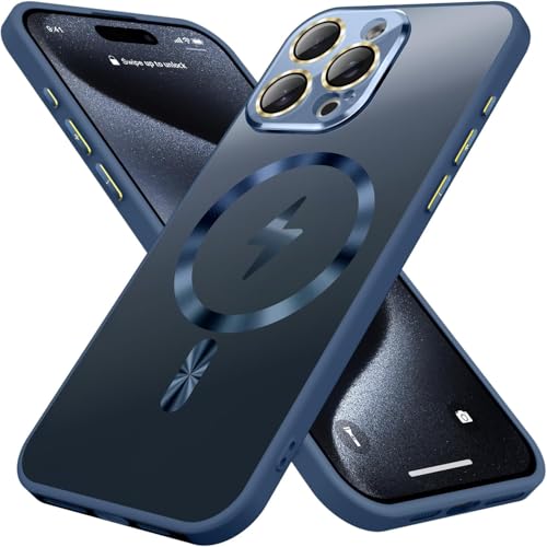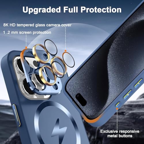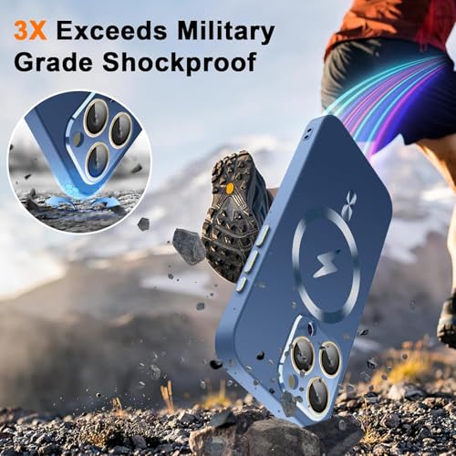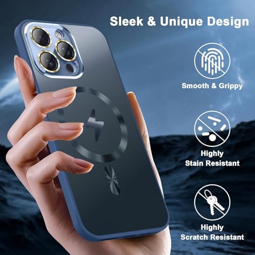 ELMO3EZZ - جراب حماية مغناطيسي مع واقي عدسة كاميرا كامل مختبر للسقوط بمعيار عسكري ومقاوم للخدش والصدمات بلمسة مطفية لآيفون 14 برو ماكس، لون أزرق
