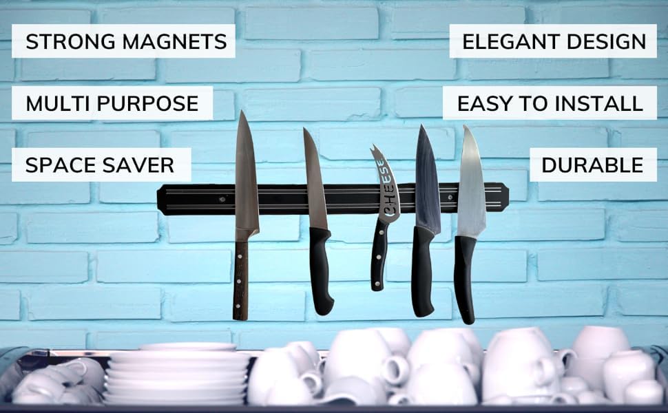 - قوة مغناطيسية: شريط مغناطيسي قوي يثبت سكاكين المطبخ بأمان في مكانها، مما يحافظ على سهولة الوصول إليها مع توفير مساحة قيمة على الطاولة