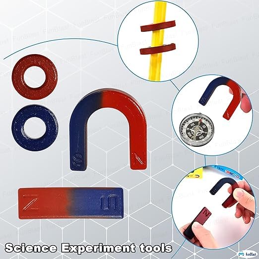 - تتضمن مجموعة التجارب المغناطيسية الكاملة ستة بوصلة مغناطيسية ومسحوق حديد للاكتشاف اليدوي