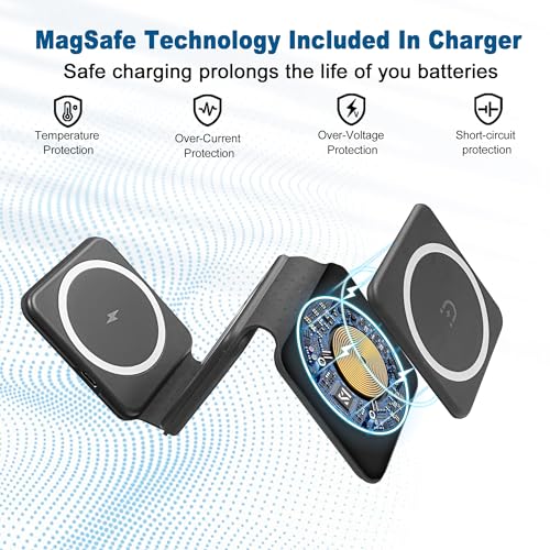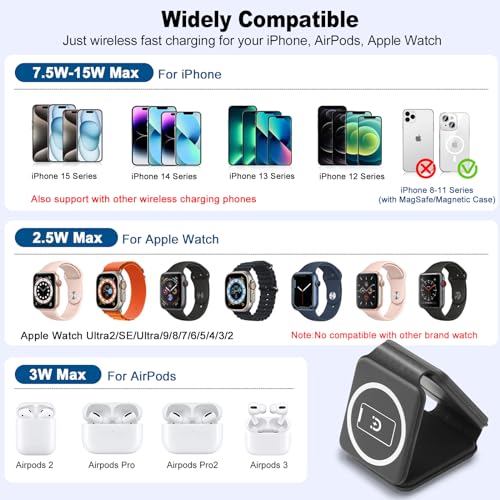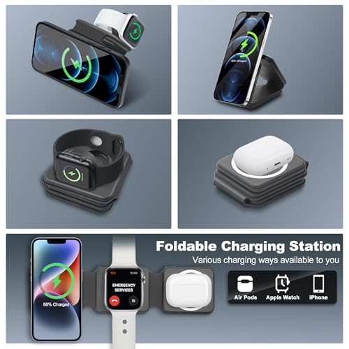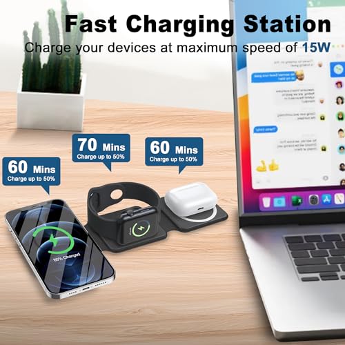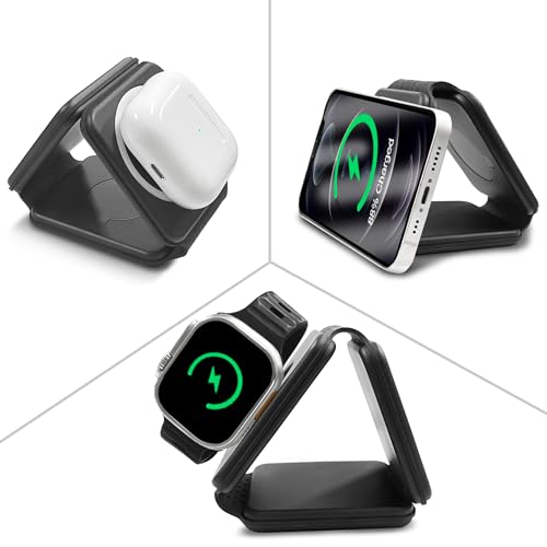 EFAITHLIFE - شاحن لاسلكي مغناطيسي لايفون: قاعدة شحن 3 في 1 قابلة للطي لاجهزة ابل المتعددة - قاعدة شحن للسفر لساعة ابل ايفون 15 14 13 12 برو ماكس بلس وايربود (اسود)