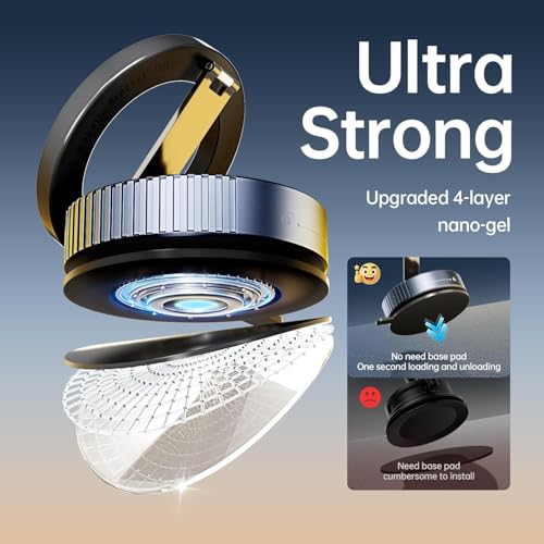 - نظام تثبيت متطور بالشفط: توفر القاعدة اللاصقة النانو المُطوّره مع مقبض القفل الميكانيكي امتصاصًا قويًا بضغط الهواء. ما عليك سوى الضغط والتدوير للقفل لتثبيته بإحكام على لوحة القيادة أو الزجاج الأمامي.