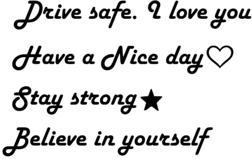 - عزز ثقتك وإيجابيتك مع اقتباسات تحفيزية مثل "Drive Safe" و "Believe in Yourself" و "Have a Good Day". تعمل هذه الملصقات كتذكير لطيف للحفاظ على تركيزك والقيادة بعناية واحتضان كل رحلة بعقلية إيجابية.