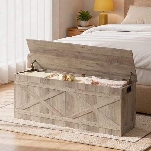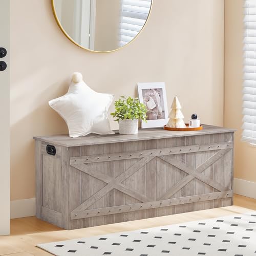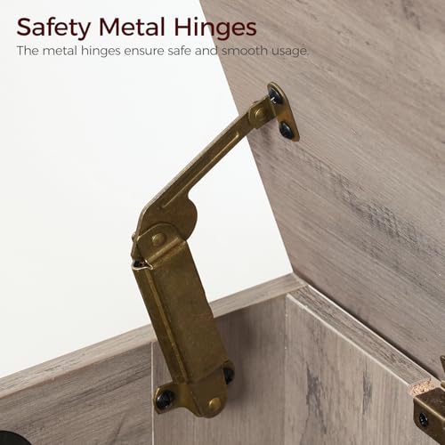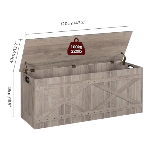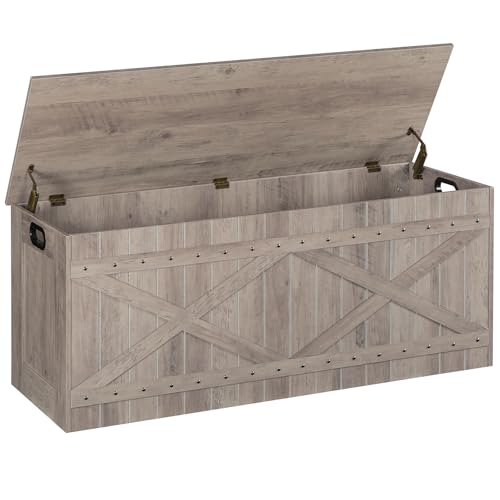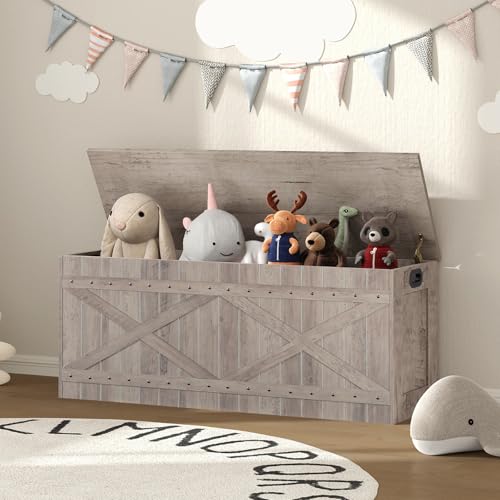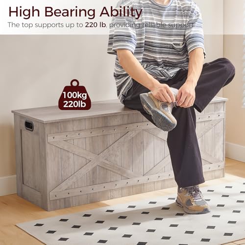 MAHANCRIS - صندوق تخزين ألعاب كبير مع مفصلات أمان، صندوق ألعاب خشبي، مقعد تخزين مع مسامير، صندوق تخزين لغرفة النوم وغرفة المعيشة والمدخل، لون رمادي، طراز SCGY18501 من ماهانكريس