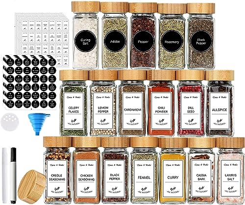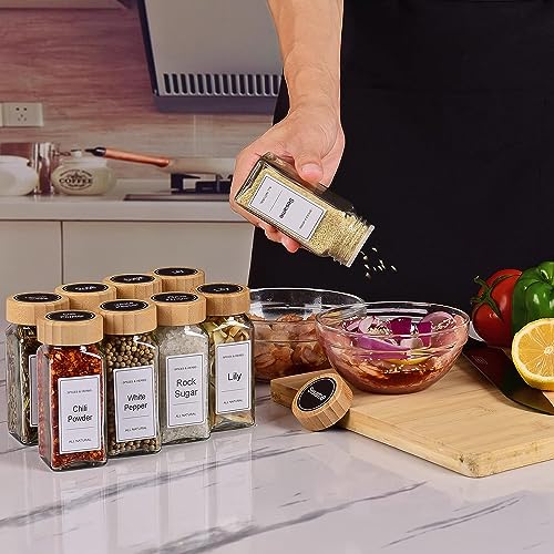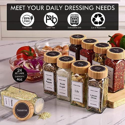 MahMir - ماهمير® 24 قطعة من برطمانات التوابل مع ملصقات - توابل زجاجية سعة 4 اونصة اغطية الخيزران 120 ملصق شاكر قمع قابل للطي 2 قلم زجاجات تخزين لرف والخزانة