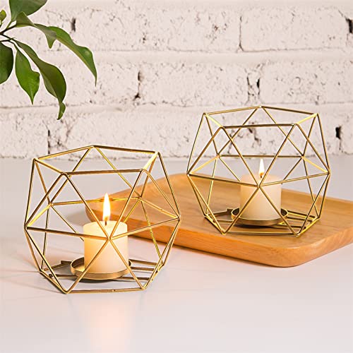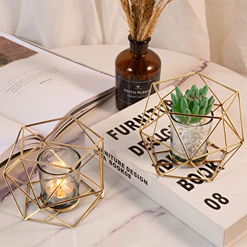 MAINFOR - حوامل شموع صغيرة هندسية مع أكواب نذرية زجاجية من ماينفور، ديكور استقبال الزفاف، قطعة مركزية للطاولة، حامل شمعدان معدني حديد للشموع العمودية، قطعتان ذهبي