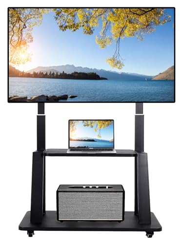 Maiproo - حامل تلفزيون متحرك بعجلات من مايبرو، حامل تلفزيون دوار للشاشات المسطحة وليد المنحنية وLCD واوليد مقاس 42-86 بوصة مع ارتفاع قابل للتعديل، حامل تلفزيون أرضي مع رف لاب توب وDVD، يتحمل وزن 80 كيلوجرام