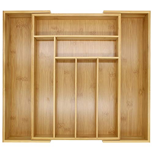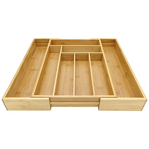 - درج أدوات مائدة قابل للتمدد من الخيزران 6-8 مساحات تخزين قابلة للتعديل، صينية متينة بشكل طبيعي ومقاومة للماء، منظم مطبخ خشبي ام اند دبليو