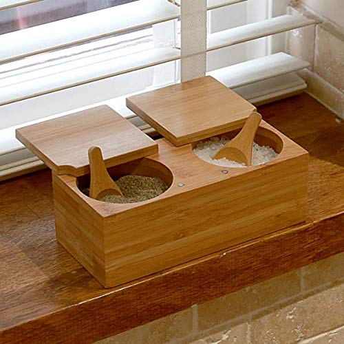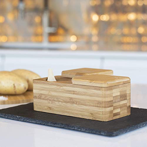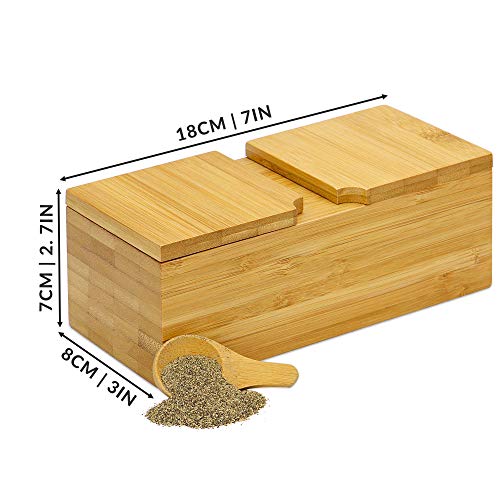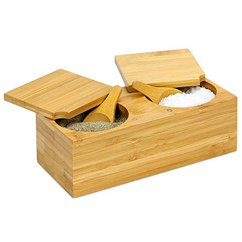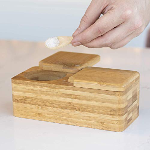 Maison & White - صندوق ملح وفلفل من الخيزران | وعاء مغناطيسي بمفصلات يتضمن ملعقتين | خنزير خشبي مقسم جزأين للأعشاب والتوابل | ام اند دبليو