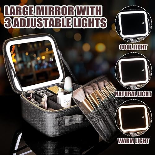 HOOKOR - شنطة مكياج مع مراة باضاءة LED، شنطة مكياج للسفر لتنظيم مستحضرات التجميل مع مراة واضواء، شنطة مكياج مع مراة مضيئة ولوح فرش مقسم قابل للتعديل (اسود)