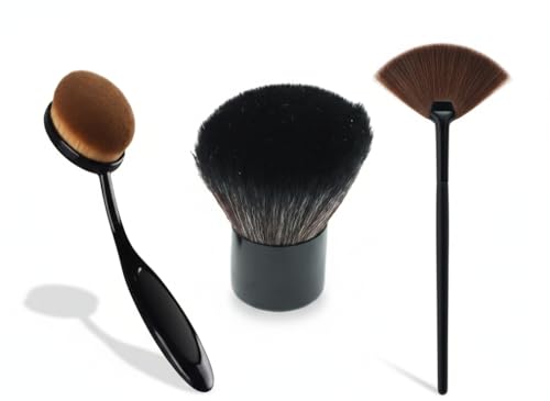 Generic - مجموعة فرش مكياج، 3 قطع، مقبض اسود، فرشاة كريم اساس بيضاوية، فرشاة كابوكي، فرشاة مروحة