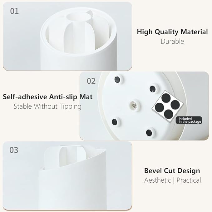 - قاعدة قابلة للدوران مع بساط لاصق - قاعدة قابلة للدوران 360 درجة، يتم تحويلها إلى الزاوية المفضلة لديك لسهولة الاستخدام ووضع جيد المظهر. توجد 4 رقع سيليكون دائرية داخل العبوة، والتي يمكن لصقها على أقدام الدعم الأربعة في الجزء السفلي من منظم فرش المكياج من أجل الثبات.