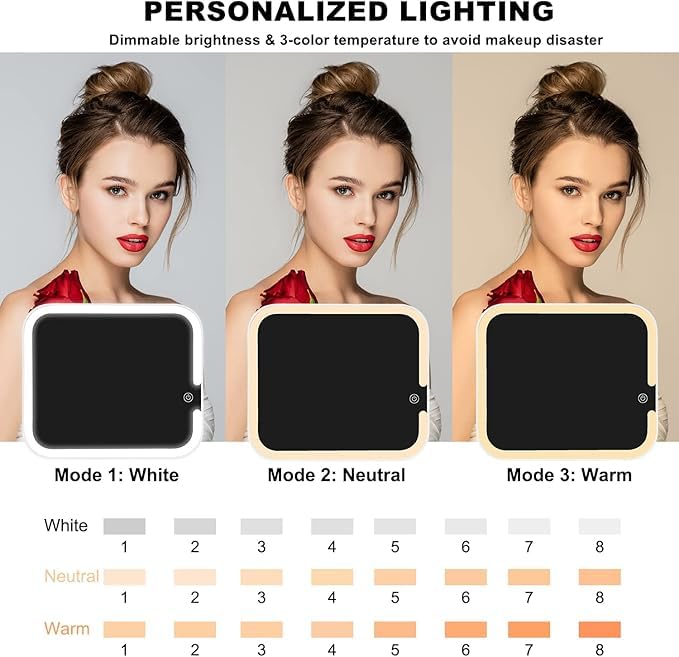 - هل تعاني من الإضاءة السيئة؟ تتيح لك المراية المدمجة التي تعمل باللمس بإضاءة ليد وضع المكياج في أي مكان، بدءً من السيارة وحتى المكتب، دون إجهاد. الإضاءة المثالية دائمًا في متناول يدك.