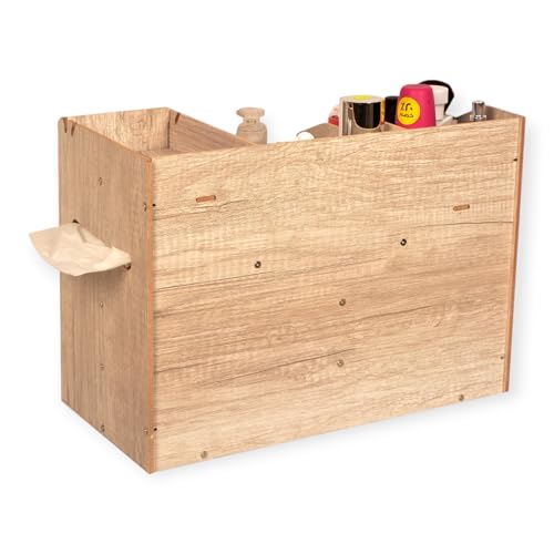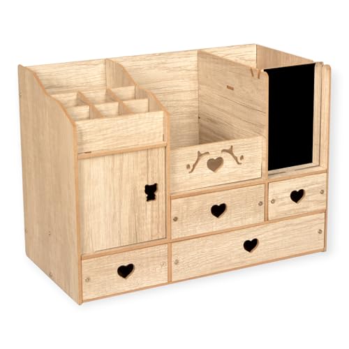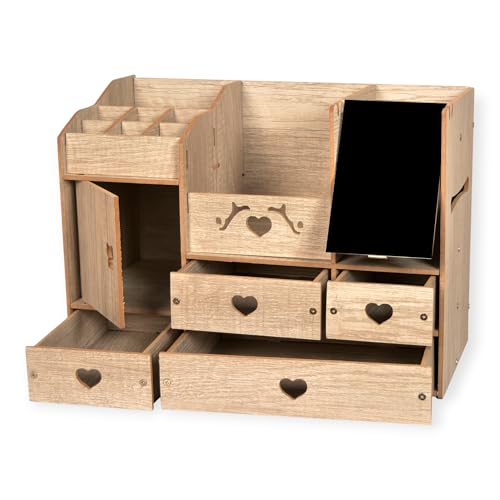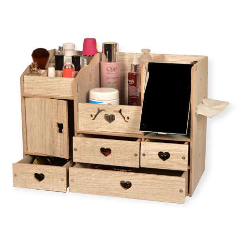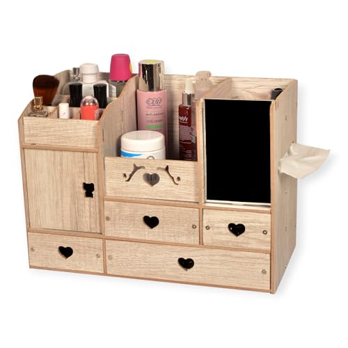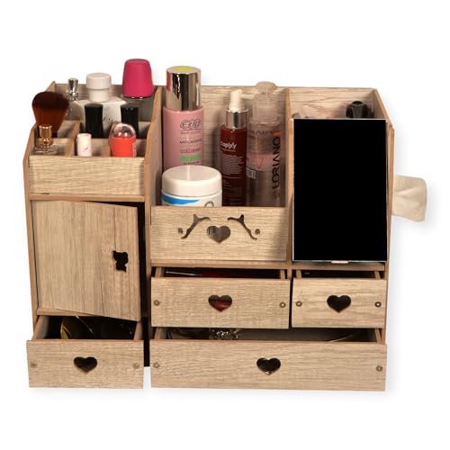 POLY WOOD - منظم مكياج واكسسوارات بمرآة و4 أدراج – 15 قسم تخزين – تصميم عصري خشب صناعي مطلي – لون رصاصي – مع رف مناديل – مناسب لطاولة الزينة أو الحمام – هدية مثالية للبنات والنساء