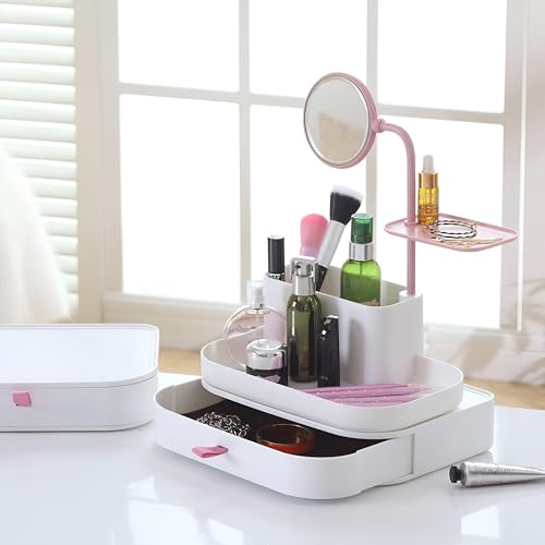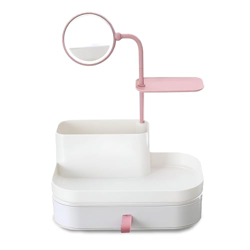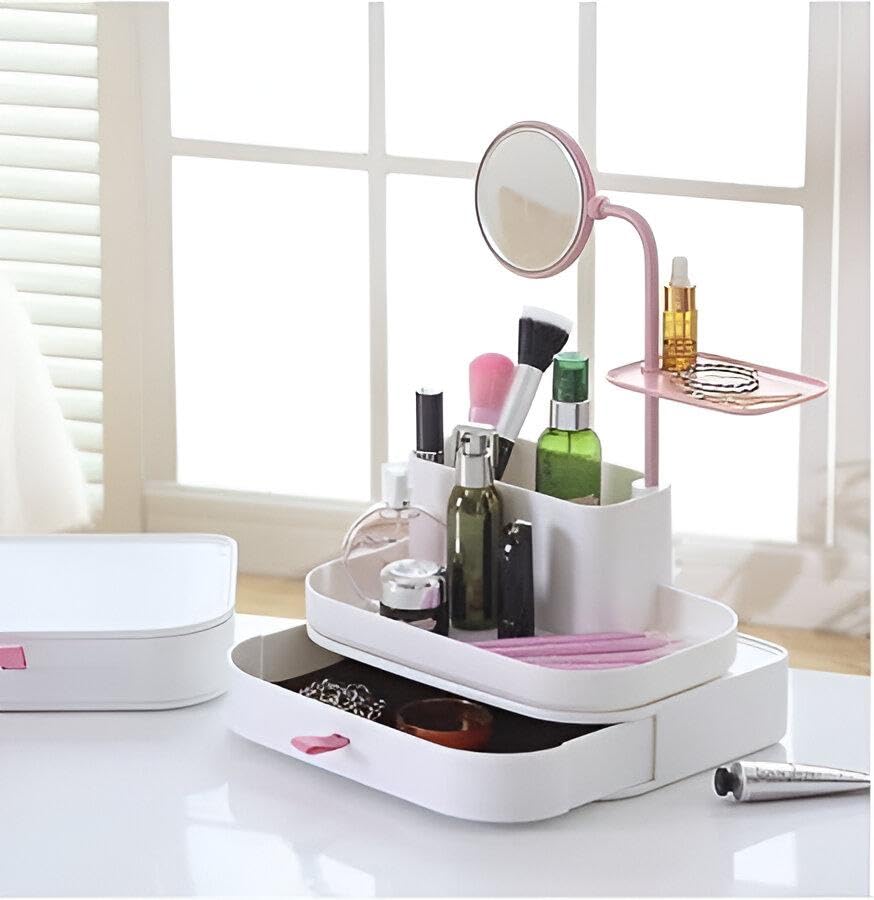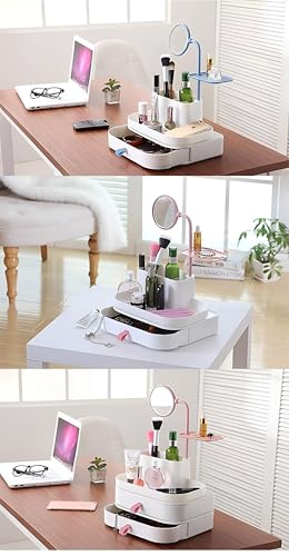 - منظم المكياج هذا مصنوع من البلاستيك المتين عالي الجودة، مصمم بمساحات تخزين متعددة ودرج كبير للحفاظ على جميع أدوات التجميل الخاصة بك مرتبة بدقة وسهولة الوصول إليها، مما يقلل من الفوضى ويوفر مساحة على طاولة الزينة.