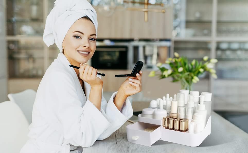 - تنظيم كامل لمستحضرات التجميل - مصمم لمساعدتك على الحفاظ على مجموعة مكياجك مرتبة ويسهل الوصول إليها، ويوفر مساحات تخزين مخصصة لأحمر الشفاه والفرش ومنتجات العناية بالبشرة وإكسسوارات التجميل. تساعد على تقليل الفوضى مع جعل طاولة الزينة تبدو نظيفة ومنظمة كل يوم.