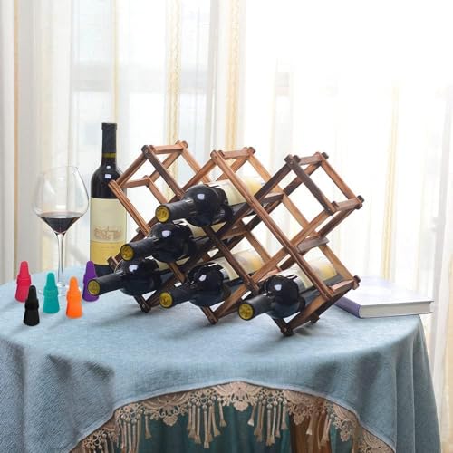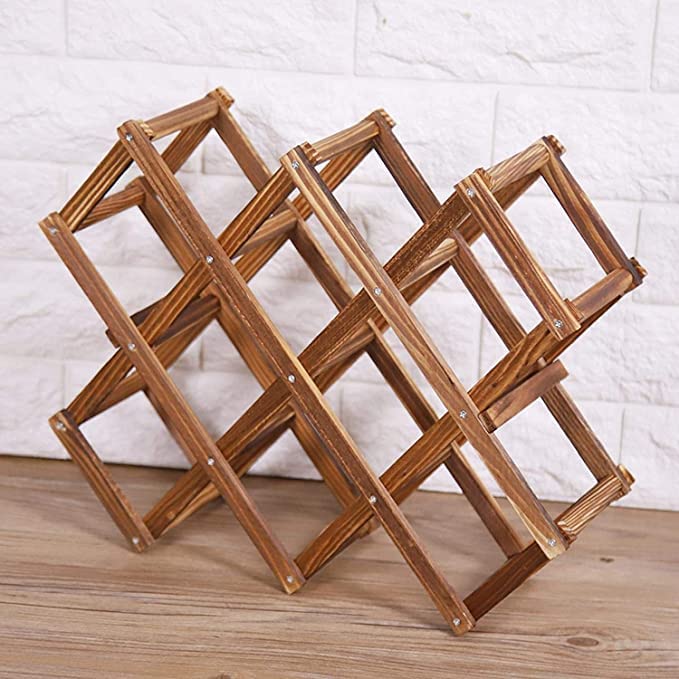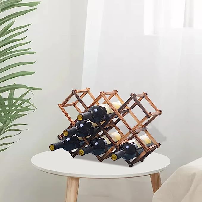 ZLW - رف خشبي لتخزين المشروبات والعاب المكياج، 10 زجاجات قابلة للتكديس على سطح الطاولة | حامل نبيذ خشبي صلب قابل للطي قائم بذاته للمطبخ والبار والخزانة | رف عرض ريفي (بني)