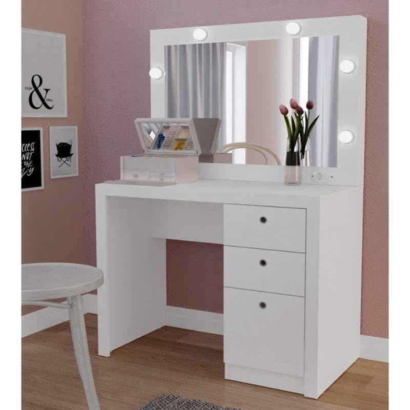 Homz - ترابيزة وضع مكياج، تسريحة بمراية بضوء ليد و3 أدراج، أبيض