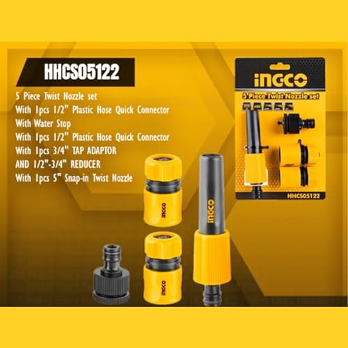 - مع قطعة واحدة من محول حنفية 3/4 ومخفض 1/2 – 3/4. مع 1 × مجموعة من 5 فوهات سريعة تثبت باللف مغلفة في عبوة ورقية بشماعة للتعليق