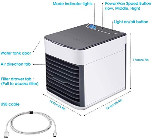MallHoo - جهاز مبرد الهواء المحمول بمنفذ USB، مبرد هواء ميني بمروحة قطبية للاستخدام الشخصي، جهاز تعديل رطوبة الجو بـ 3 سرعات قابلة للتعديل واضاءة LED ملونة، مروحة تبريد للمكتب والمنزل