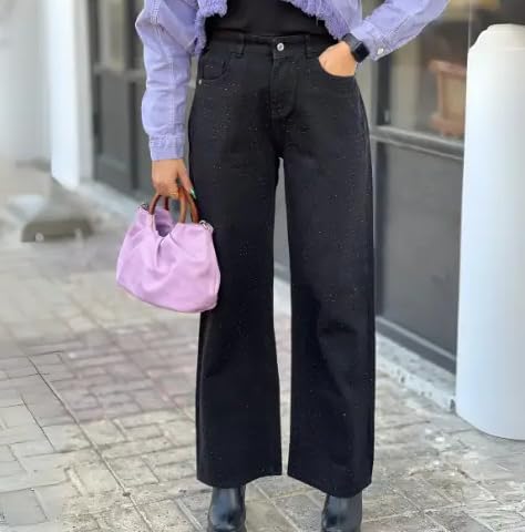 Mamilly Jeans - بنطلون جينز بارجل واسعة مرصع باحجار الراين من ماميلي جينز، نمط كاجوال بخصر مرتفع OBS-350BL