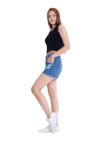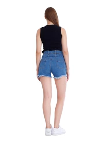 Mamilly Jeans - Mamilly Jeans شورت جينز بحزام خصر مزدوج وتصميم ممزق وخرز نسائي